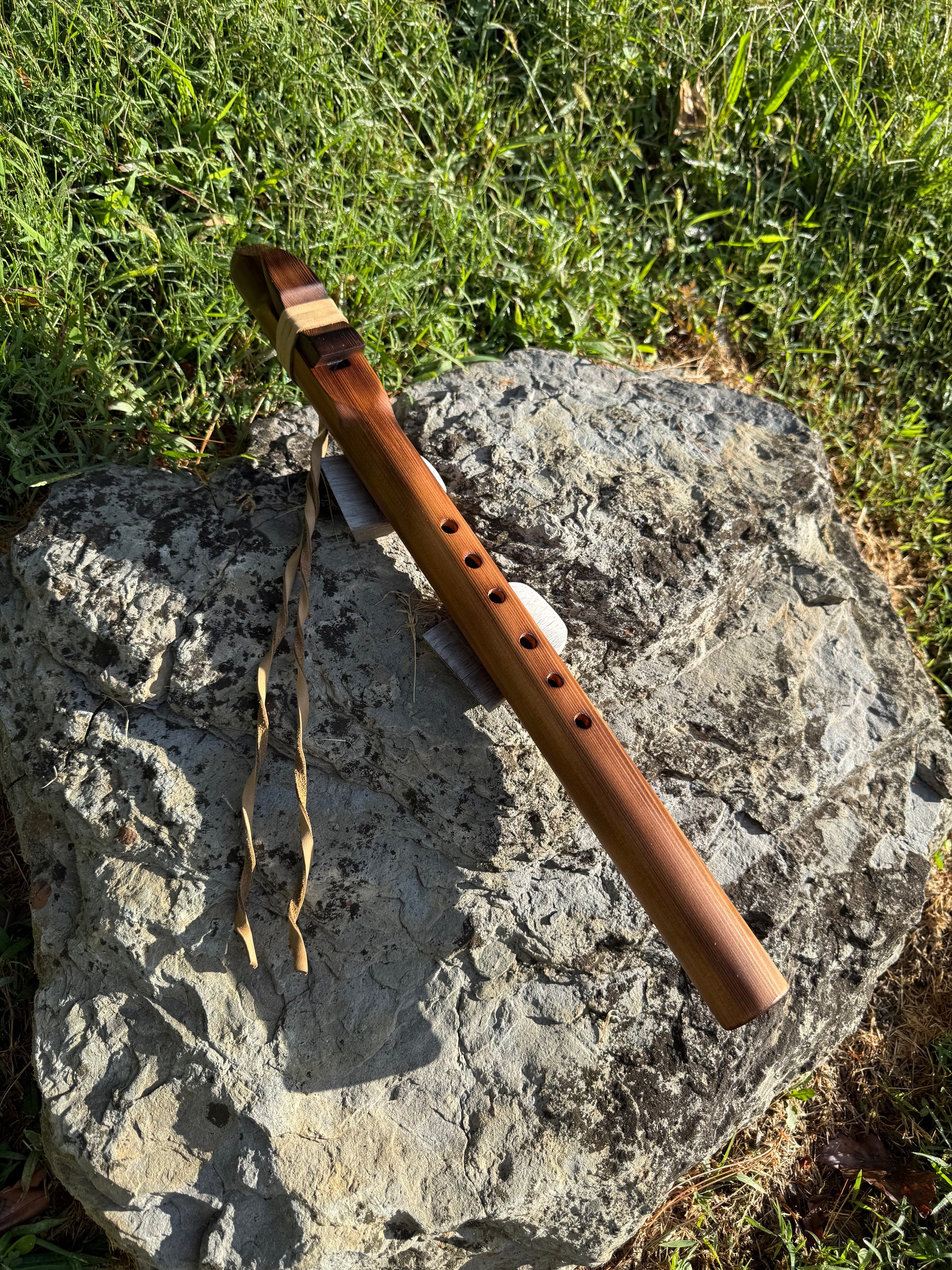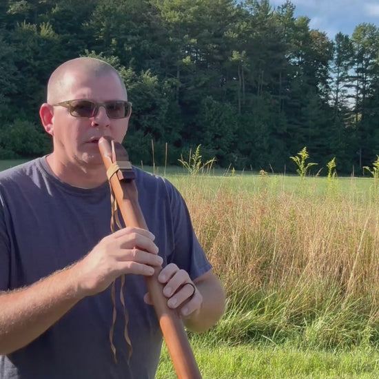 This Native American Style Flute is handmade from quality Western Cedar and has a warm, clear tone that’s easy to enjoy. Tuned to the minor pentatonic scale in the key of E minor, it’s great for both beginners and experienced players. The flute is 21” long with a 1” bore, and the finger holes are evenly spaced 1” apart, ranging in size from 5/16” to 3/8”. A beautiful and playable instrument for music or meditation.